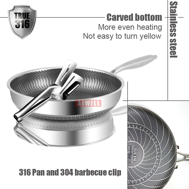 AIWILL Kitchen Quality 316 /304 Stainless Steel Frying Pan Nonstick Pan Cooking Fried Steak Pot Electromagnetic Furnace General