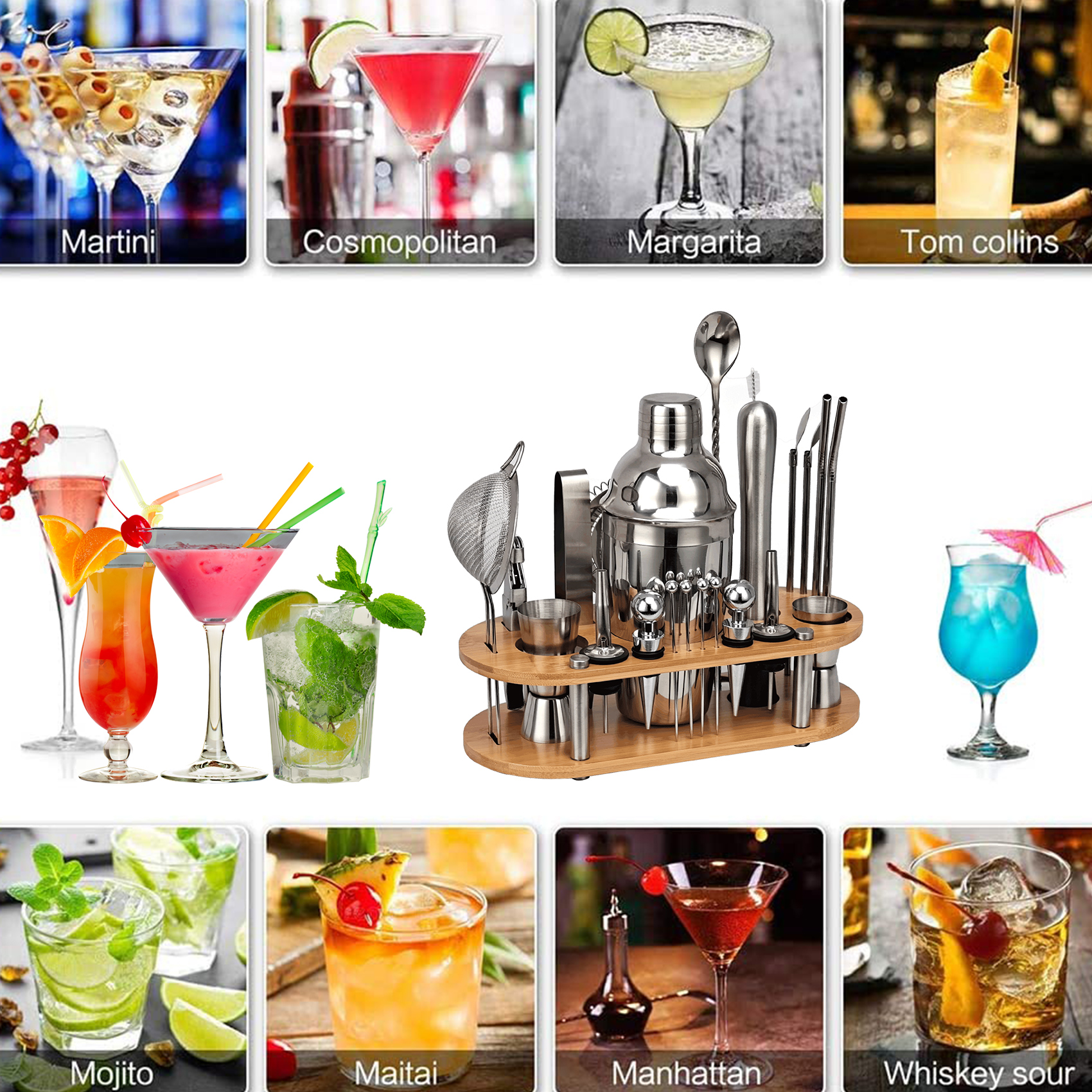 23-Piece Cocktail Shaker Set,Bartender Kit With Oval Bamboo Stand Detachable, Home Bar Tools Stainless Steel ,Perfect Gift